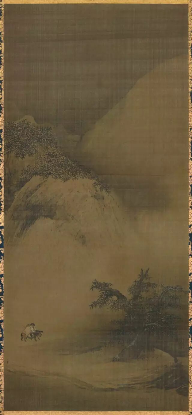 该图描画了两个身着白色披风、头戴风雪帽的骑驴人穿行山谷的情景。画面右边的两棵老树,有着虬曲的枝干和稀疏的树叶,是梁楷以细致的笔法刻画出来的。画面中部以簇点画密林,而山体的皴笔则较少,在以淡墨渲染的天空映衬下,给人以白雪皑皑之感,整个画面呈现出一种荒凉萧瑟的氛围,堪称南宋院体山水画的经典之作。东京国立博物馆是这样介绍该画的,“作品以雪山为背景展现了荒漠所独具的巨大山水空间,而骑驴人和雁群等微小的存在也得到了精细的表现,可谓是一幅显示了梁楷也同样擅长精密画风的力作”。