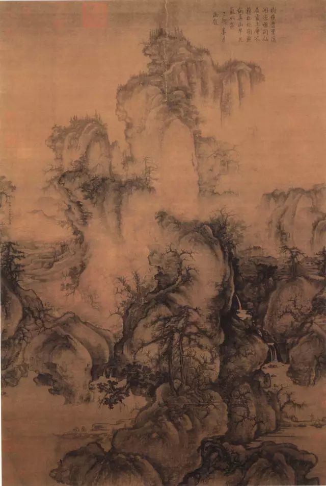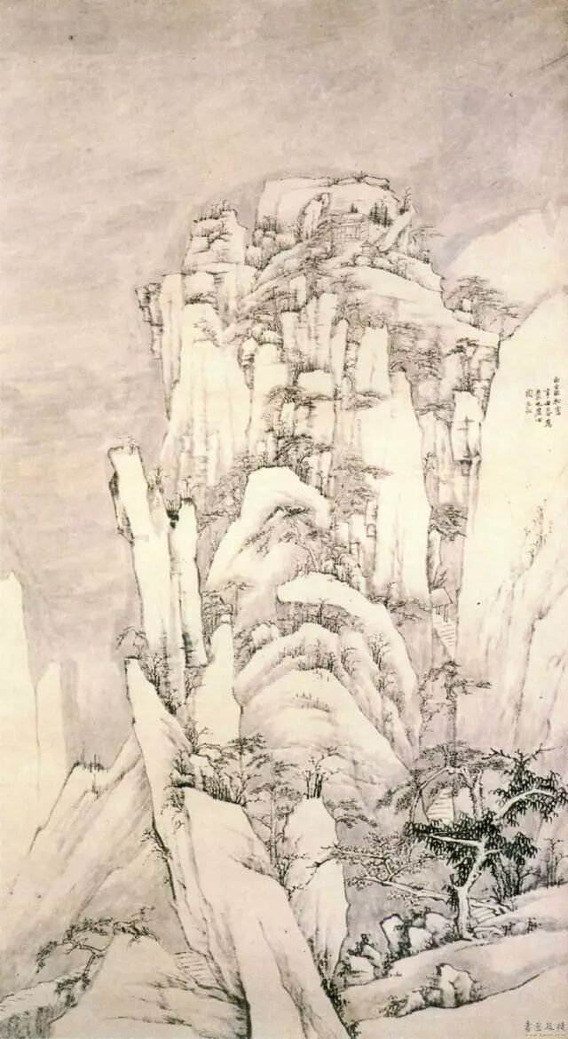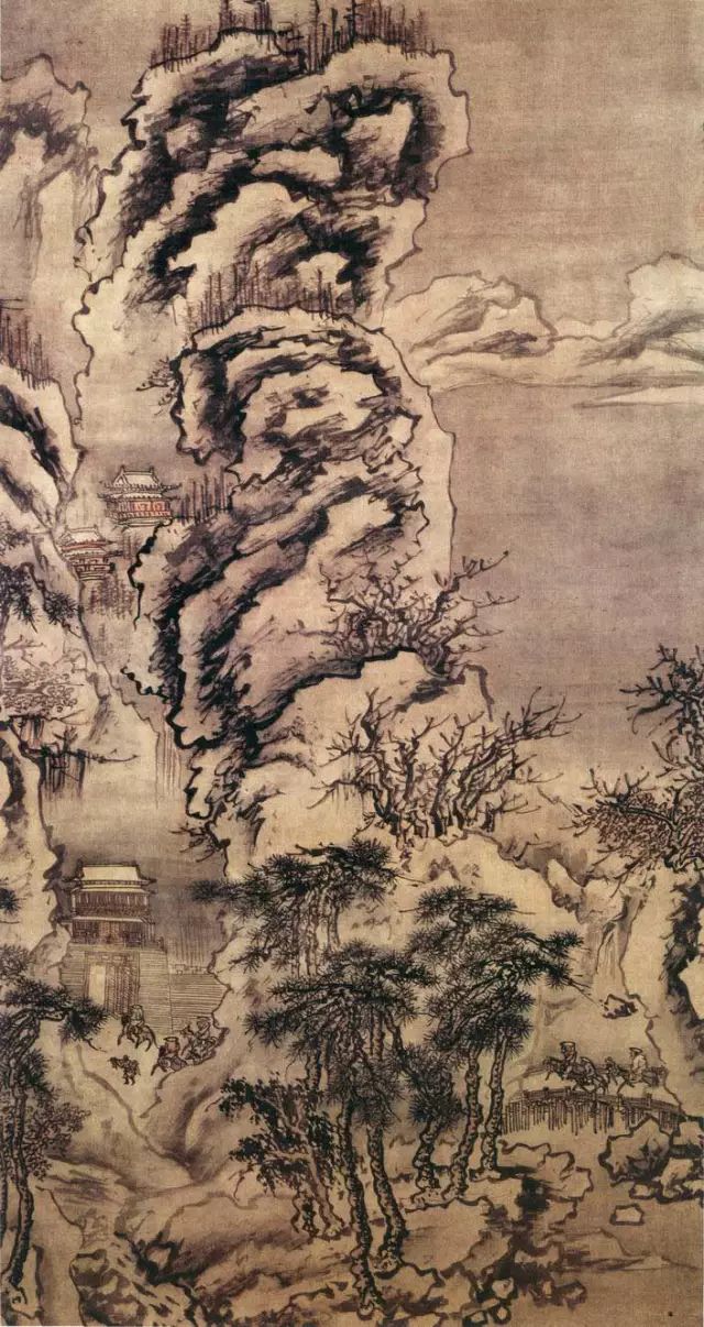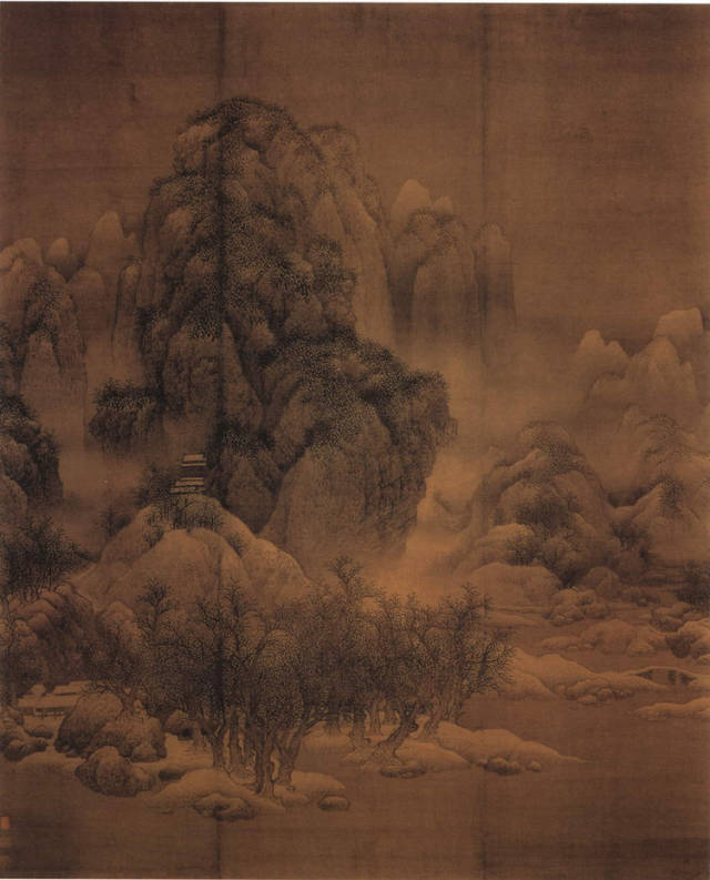 本幅画构图大致可分为三景,主山双峰屏立,雄巖峻险,表现出奇峰积雪霭霭\幽深的北地景致,俨然具有北宋气度,而两侧锯齿状的岩块,看似突兀奇倨,但却有增强画作张力的视觉效果。中景楼阁隐现山石间,客旅行於山径上,近景则画河岸两侧,枯枝树石。山石皴法及造型似从披麻、卷云皴而来,林木方面,松针尖挺,枯枝似郭熙蟹爪,但运笔布墨极具画家个人的特质。虽然诗堂上有董其昌鉴定的题款,但笔法与巨然平淡天真的江南风格有别,可能是宋人宗法李成风格之作。