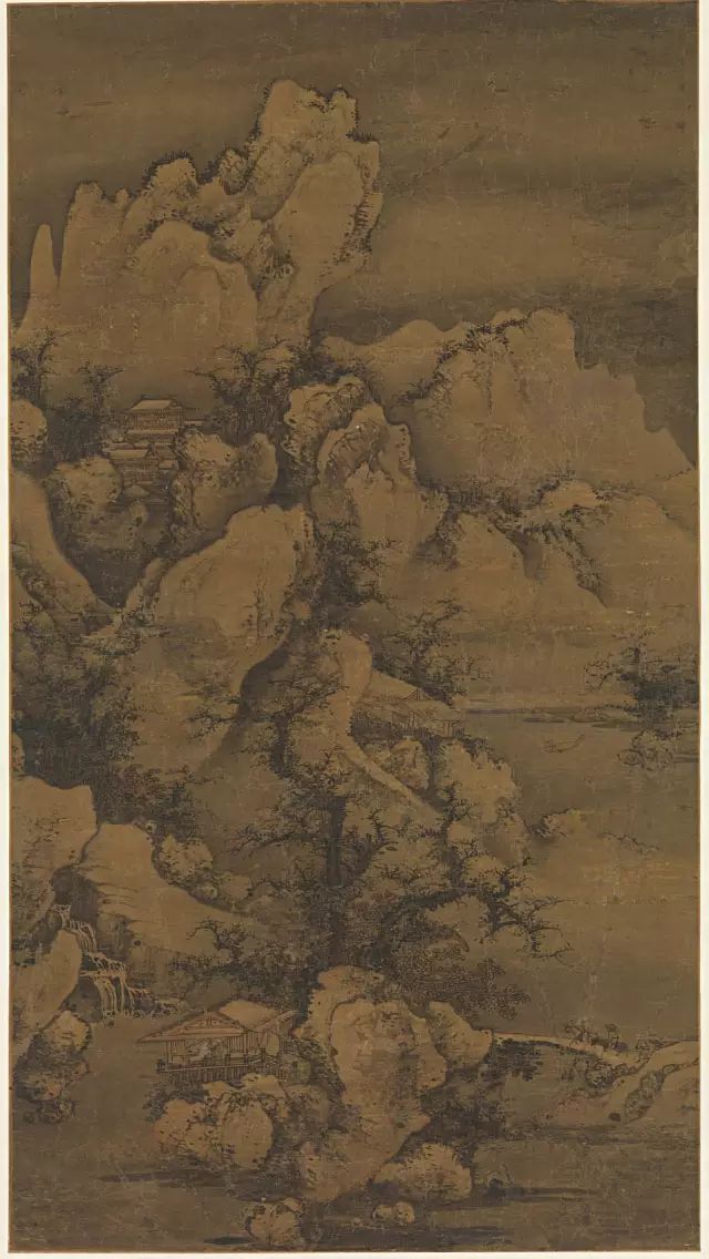 此画构图奇峭,山峰走势怪异,树石坚硬,房屋琼楼掩隐于山峰后面,与远处的云霞相接,很是俊朗动人。仔细看庭院的屋中有几人正在下棋或玩耍,院中一人正在扫雪,路上一主一仆正向庭院走来,整个画面体现了一个“闲”字。先以淡墨勾石骨,由淡而浓,多次皴擦,层次加深,似先用湿笔,然后用干笔皴擦,作解索皴、牛毛皴等。用笔活而不乱,层次井然。