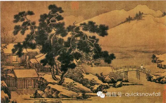 雪地实景,苍茫而润泽,冰雪覆盖了自然界中的山川树木,使人们的视觉不再被五彩缤纷的万物所迷惑,从而使人们更为关注于白茫茫的冰雪积压、融变的过程,这种自然属性恰好与水墨形式相得益彰。因此,雪景山水画一直是中国山水画中的一个很有特色的部分。
