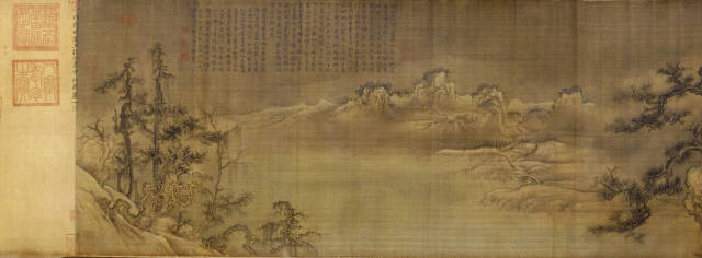 画面以白粉为雪,树头和芦苇及山顶、沙脚微梁金粉,又以破墨晕梁,表现雪后初晴的轻丽阳光,这是他独创之法。整个画面寒汀疏林,薄积小雪,一只只小船和渔民张网垂钓的情景在寒林中形成妙趣。这渔民的劳作和整个画面的阴冷荒寒气氛之对比,令人玩味。后段的一片林木虬曲,杂树以水墨点缀而成,松针用笔尖锐,重钩,可以见出李成的影响。卷尾上有乾隆皇帝依苏东坡题《烟江叠嶂图》韵之七言诗,称此图开卷“已觉冷风拂面浦,又如湿气生银田”。