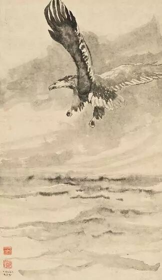 临水飞鹰 李铁夫 纸本水墨、铅笔 81.6cm×46.3cm 1945年 广州美术学院美术馆藏