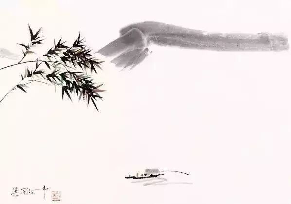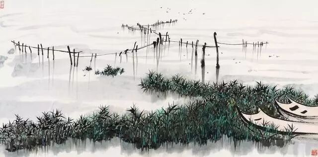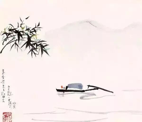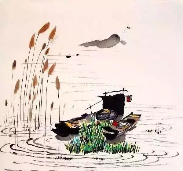 “野渡无人舟自横”,孤舟闲飘,静穆入画,诗与画之美于此悄悄相依。