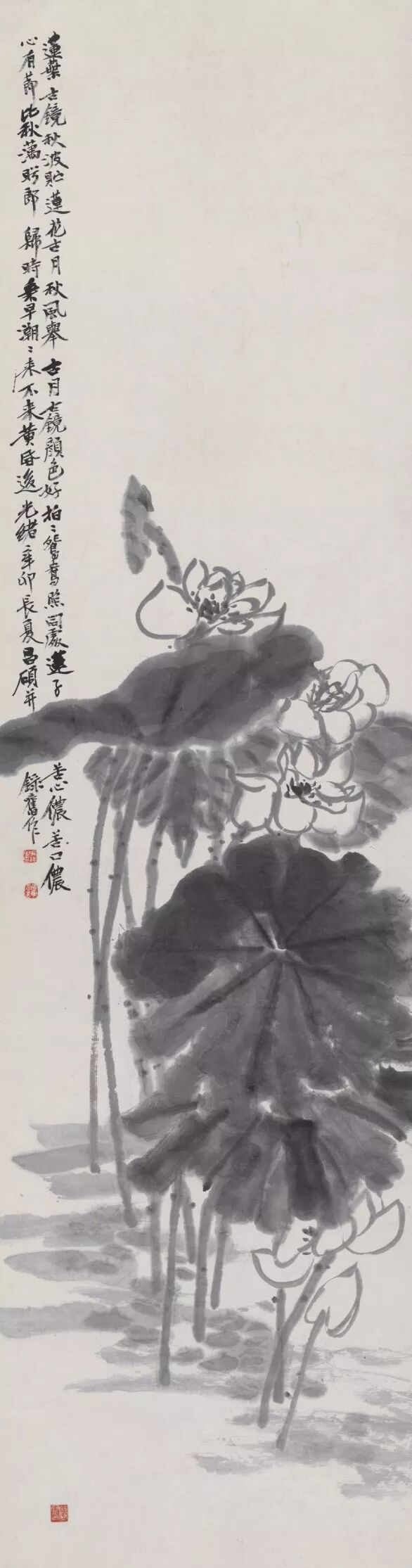 吴昌硕画荷花。上承陈道复、徐渭、石涛、八大,近接任伯年、蒲华等人,在吸收前人的基础上,自出新意,开创出新的格局。他的荷花沿袭文人画一路,古雅清新,而笔墨大气磅礴,意境壮阔,增添雄浑之气。