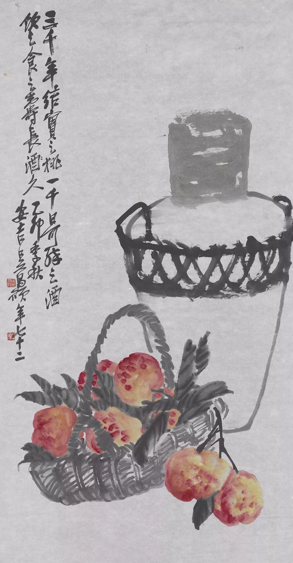桃被人们视为长生不老的象征,大概源自古代神话里西王母送仙桃给汉武帝的故事。吴昌硕画的仙桃,硕大红润,饱满诱人,浓郁的色彩直落纸上,再衬以盘曲的老干,给人以仙树仙果的想象。有的还画上大坛的美酒,粗剌剌的酒瓮古朴厚重。既有民间的审美情趣,又融汇了文人的笔墨意蕴,用朴实无华的美好打动人心。