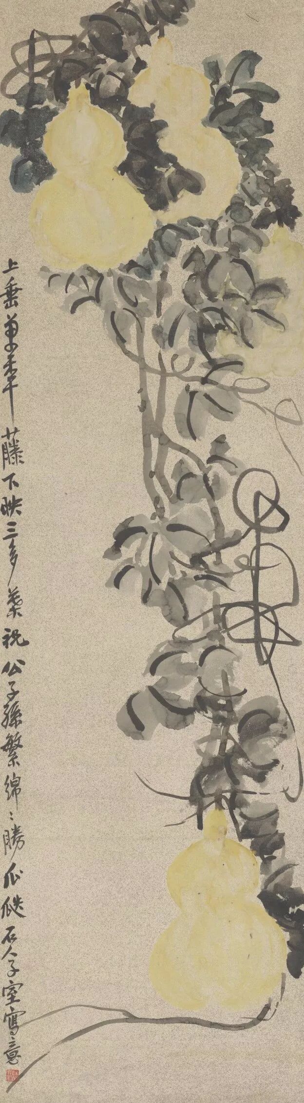 吴昌硕常画的寓意吉祥的花卉植物还有桃、荔枝、紫藤、葫芦、雁来红等等,都带有浓浓的市井意味。