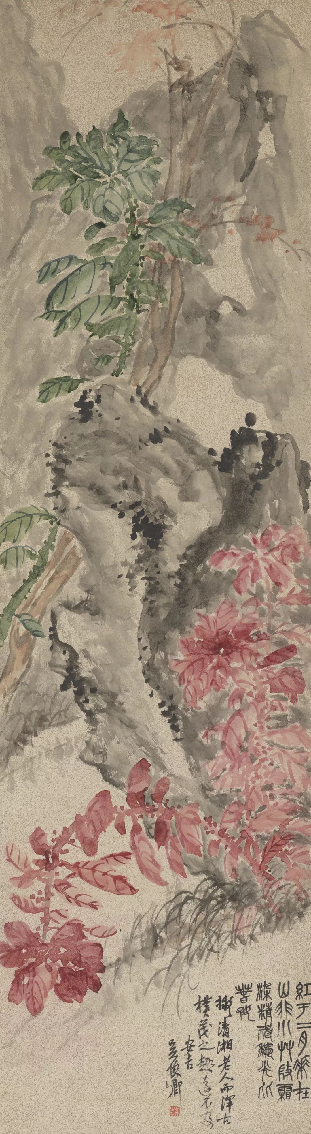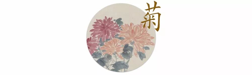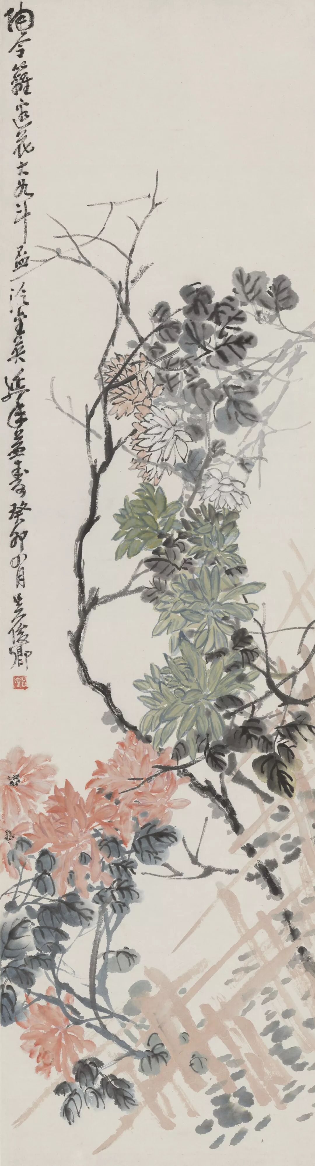 菊花也是吴昌硕笔下的常见题材,有墨菊、黄菊、红菊、白菊等,多是园间常见的品种,形态野逸天然,长势蓬勃向上,或倚石生长,或有篱笆相伴,体现的正是“采菊东篱”隐逸脱俗的诗意。画法也随形而变,有的用墨笔双勾,有的直接以色作没骨。设色古艳,藤黄、朱砂、胭脂都参以淡墨,使色彩的饱和度降低,也符合秋日里花朵带着些许风霜的颜色。菊花在秋季开放,故为秋的象征,人们将九月称为“菊月”,因为“菊”与“据”同音,“九”又与“久”同音,所以菊花也用来象征长寿或长久,菊与松树画在一起,被称作“松菊永存”。画菊为长者贺寿,美意延年,也是吴昌硕频频画菊的重要原因。