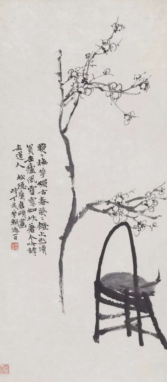 吴昌硕喜爱画梅花,带有缘物寄情、写物附意的情感寄托。“苦铁道人梅知己,对花写照是长技。”梅花独立寒冬的孤高品格是吴昌硕用以自比的象征。宋以来,画梅大家代有人出,如王冕、陈宪章、金农、汪士慎等,他们所画梅花各具特色,极尽梅花清高孤傲的品格,寄托了画家的精神气息。吴昌硕画梅颇有自己的独到之处,他喜欢表现老梅。老梅虬曲的枝干好似铮铮铁骨,与轻柔纤嫩的花朵形成鲜明对比。吴昌硕画梅少有全树,也非千枝万蕊,而是有如特写镜头,构图疏阔纵放,气势捭阖,点点梅花,疏密有致,极富节奏之变。焦墨枯笔,顺来逆去。枝丫纵横,曲中求直,苍劲之极。花以焦墨圈勾,精细而怒张,仿佛想要从枝上挣脱,凌空而去。古代文人赏梅,也正是追求这种古朴苍劲的意味,使观者仿佛置身于月色轻笼、花影横斜的意境之中。