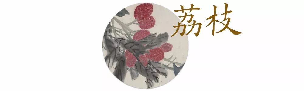 荔枝,南方佳果,味美色丹,取“荔”字谐音“利”,在民间象征大吉大利,在商业文化的氛围里更是格外受欢迎的题材。成熟的荔枝色泽鲜红,果实成串,叶片又是碧绿青翠,极有辨识度。吴昌硕画荔枝以淡红打底,再用深红点簇画出果壳上的粒粒突起,色彩在水分中有控制的晕染,质感新鲜。叶子用色掺以花青、淡墨,使颜色不过分翠绿,喜庆中透着古雅。