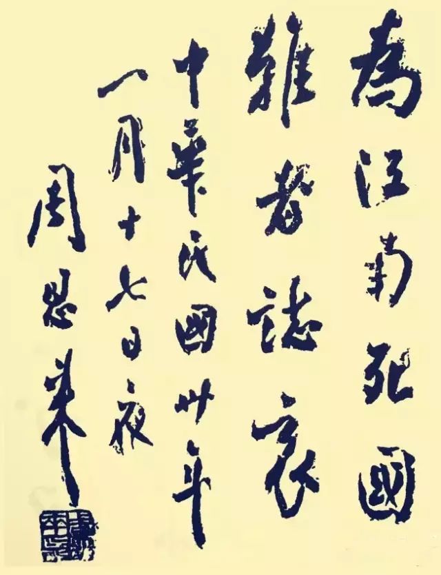 上下两幅,应该是周恩来最著名的两幅字了。字的布局大气,充满感情,将“皖南事变”带来的伤害与悲愤凝注笔端,但毫无焦躁之感,落款中来字的一竖严重扭曲,却用很大的力气将笔收住。如果过分解读一下,这恐怕代表了一种愤怒,同时又夹杂着隐忍。