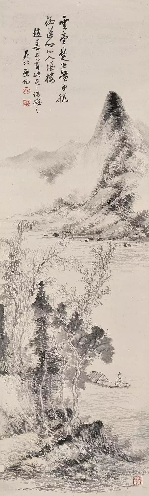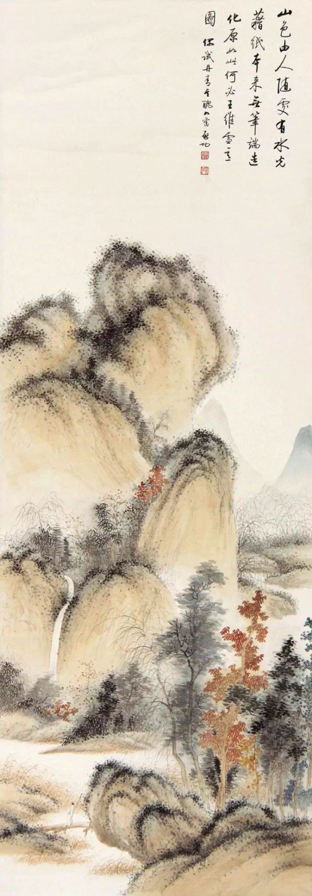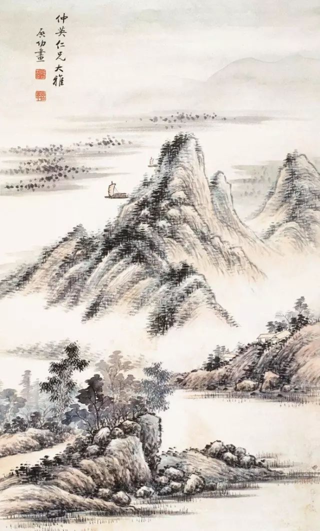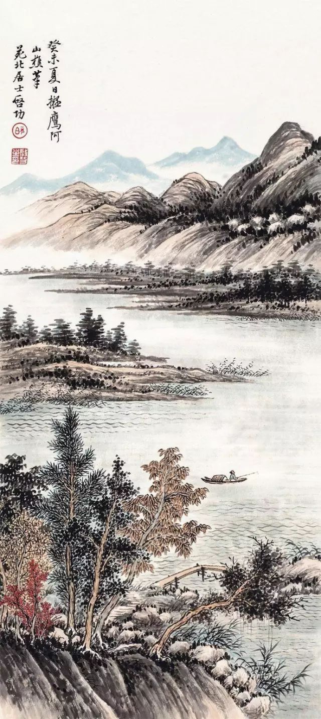 他的山水画主要也是取法的南方画派一路画法,尤其是他的老师吴镜汀就是从王翚入手,涉猎宋元明清诸家,山水画作多细笔设色,清新雅致。启功在他二位文人画家老师的教导下不仅提高画艺,在文史、书法、诗词、鉴定等各方面受益良多。他的山水画传统功夫深厚,北人南画,在画境文心的南宗山水画风貌中又透露出一股刚健清新之气。