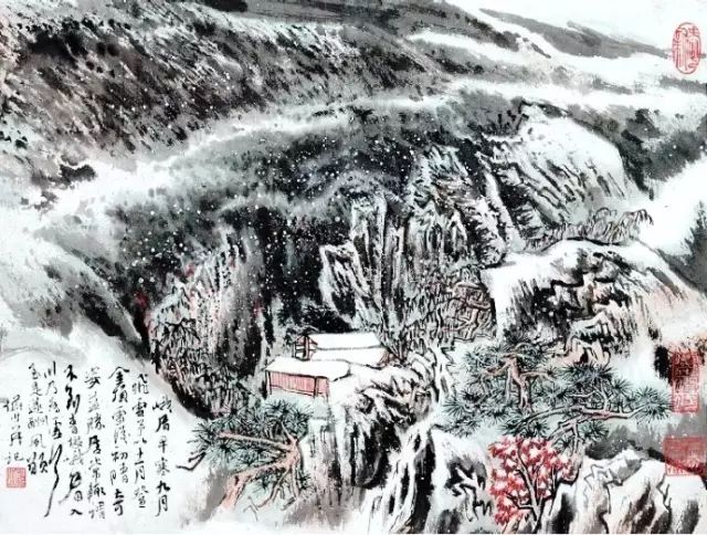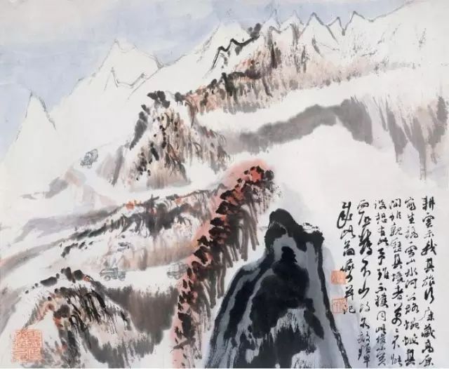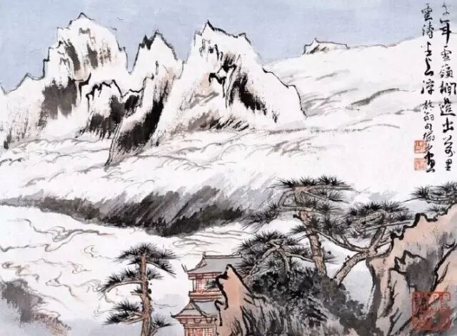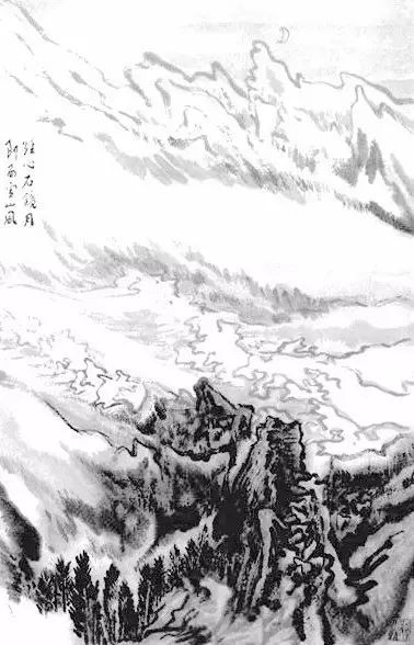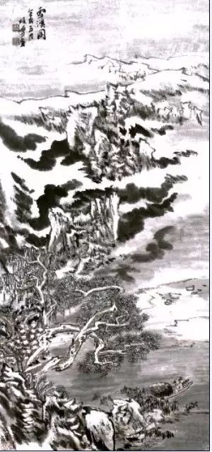陆俨少画山水,尤善于发挥用笔效能,以笔尖、笔肚、笔根等的不同运用来表现自然山川的不同变化。云水为陆俨少绝诣,有雄秀跌宕之概。勾云勾水,烟波浩淼,云蒸雾霭,变化无穷,并创大块留白、墨块之法。