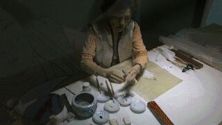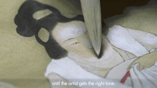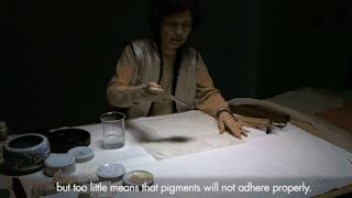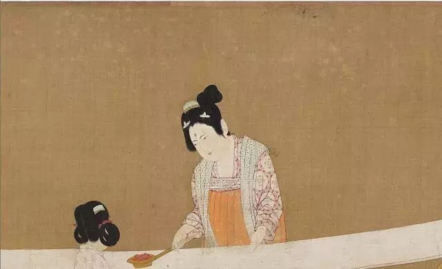 勾兑好之后,用毛笔蘸取,互相调配,层层叠加,对照着《捣练图》上色。