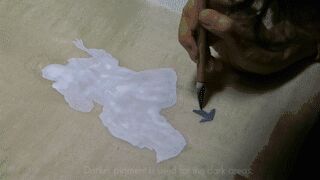 在女子衣袖边缘,用另外一支毛笔蘸水点染,两支笔交替,塑造出晕染的效果。