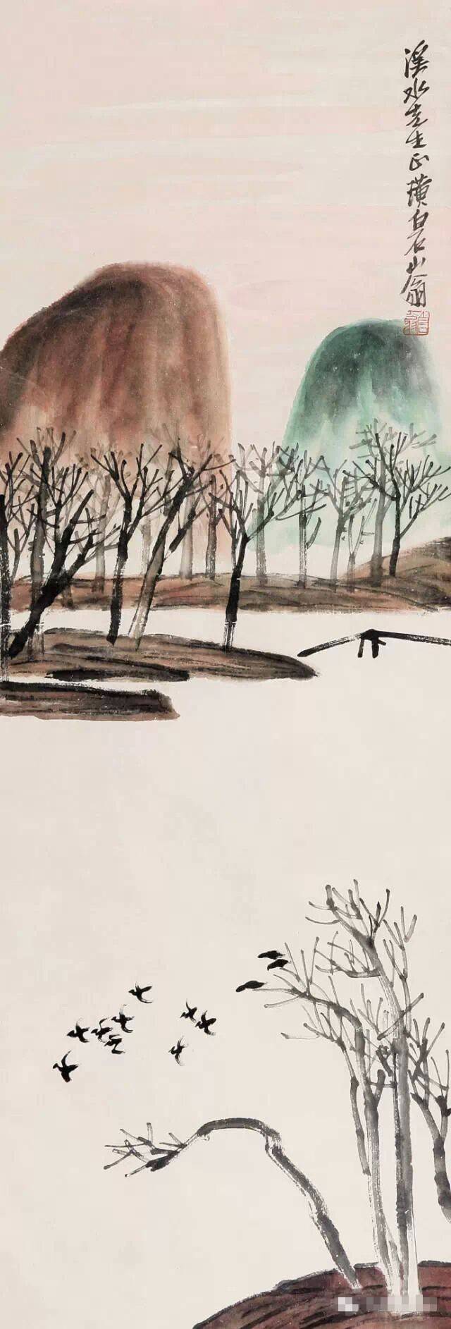 导 读 齐白石的花鸟虫鱼非常突出地表现了他继承传统而又发扬了传统的特色,但是他的山水人物则是突破时代的创作。 齐白石常言:“用我家笔墨,写我家山水。”“胸中山水奇天下,删去临摹手一双。” 齐白石的山水画,构图出奇出新,无常法而又合法,貌似平淡的笔调,大气磅礴、纯净明丽。在似与不似之间,把山水灵性的本质,或轻或重、或明或暗地表现出来,大开大合中又见细腻、朴素的善良与乐观的坚强。 白石老人的山水画,每一笔似乎都含着家乡的泥土气息,每一根线条似乎都凝结着大自然的露珠。他的真意在笔墨与观者的巧妙共鸣之间激发,读者会很自然地品尝到画里画外的个中滋味。