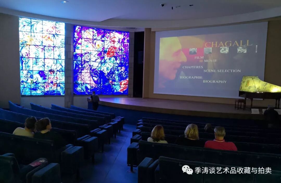 继续向前,就到了美术馆的音乐厅。夏加尔工作时喜欢听古典音乐,艺术和音乐是他生命的两个支点。所以在美术馆的设计阶段,夏加尔就希望能有一个音乐厅。音乐厅的窗户使用夏加尔设计的花窗玻璃装饰,地中海蓝色带来柔和的光线,让人仿佛置身于海底的奇幻世界。这三组花窗玻璃自右向左,描绘了上帝用七天时间创造世间。从最右侧的窗户隐喻创世纪的前四天,最右边是一片混沌,然后上帝带来第一缕光明并创造世间。中间的窗户隐喻创世纪的第五天和第六天,天地开始分明,光明普照。最左侧的玻璃则代表着上帝在完成了造物之后,静神修养。音乐厅里正在播放夏加尔的介绍视频。