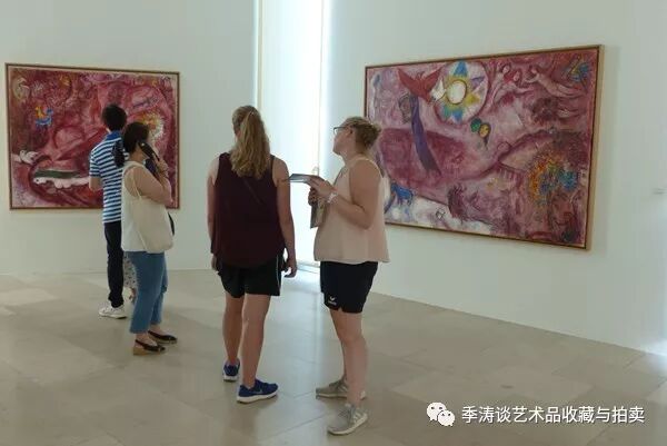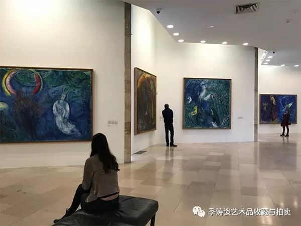 我走进夏加尔美术馆,美术馆呈两翼布局,东翼划出三个大小不同的展厅,分别展出《创世纪》和《出埃及记》主题的12幅画作,《歌之歌》主题的5幅画作,和3幅夏加尔1950年代初创作的圣经主题作品。西翼是美术馆的音乐厅,热爱古典音乐的夏加尔希望能让公众畅享艺术的同时,也能享受音乐。链接两翼的部分则展出夏加尔种类丰富的作品,跨越他生命的各个创造时期。