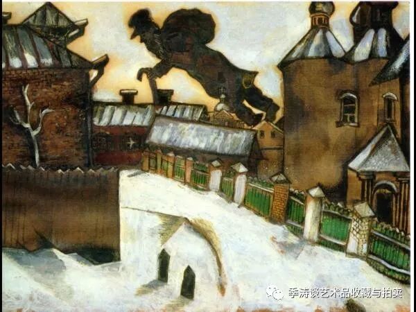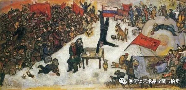 1917年俄国十月革命时期,夏加尔起初热烈拥护革命,出任维捷布斯克地区艺术人民委员,着手在当地创办美术学院和美术馆的宏大计划。但是,在两年半的紧张活动中见到美学上和政治上的争吵日益加剧之后,他放弃了工作而移居莫斯科。在那里,他一度把注意力转向剧场,为犹太作家S·阿莱切姆的剧本制作舞台布景和服装,为莫斯科小剧院作壁画。1922年夏加尔告别了俄罗斯,首先前往柏林。1923年他再次定居巴黎,这回是带着妻子和—个女儿。