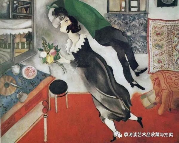 夏加尔的作品《生日》乍一看上去,画面中的两个人在飞,因为他们堕入了爱河。画中男士就是画家本人。在画中,他刚刚与未婚妻贝拉久别重逢,两个人又跑又跳,幸福之情溢于言表,就像鸟儿一般飞翔,亲吻,歌唱。画家是如此开心,以至于都不需要画出胳臂来表示他对自己爱人的拥抱,他要用自己整个的身体把爱人拥在怀中,包裹起来。