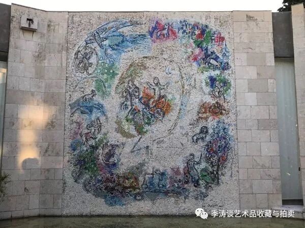 美术馆外墙的一面是马赛克嵌成的超大图案,由年逾80的夏加尔设计,马赛克艺术家完成,这是夏加尔主持的最后几件大型作品之一。这件名为《先知伊利亚》的作品,图案周围一圈是抽象化的十二星座图标,而中间常见的战神阿波罗的形象则被希伯来先知伊利亚替代。犹太人,犹太宗教,犹太文化,是夏加尔贯穿一生的精神脊梁。