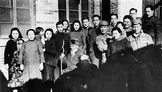 1950年,在大雅宝胡同甲2号庆祝白石老人90岁寿诞时合影,前排从左至右为:齐白石、李苦禅、李可染(抱女儿李珠)