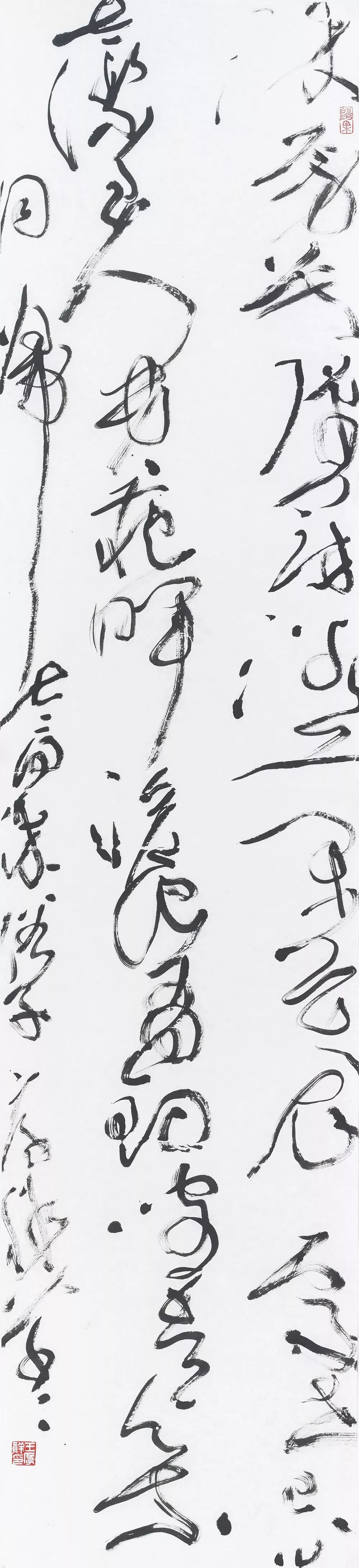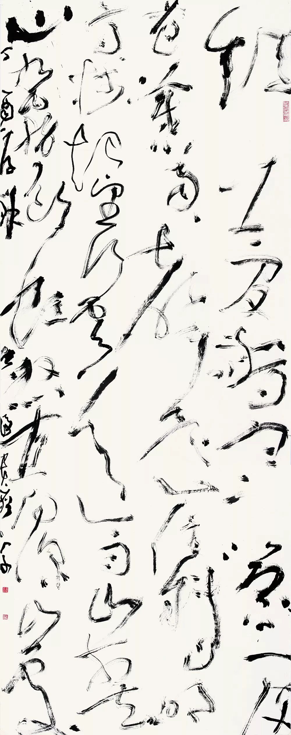 草书,特别是狂草是最能表达艺术家情感和个性的书体。张旭性格豪放、洒脱不羁,嗜好饮酒,常在大醉后手舞足蹈,提笔落墨,一挥而就;怀素性情旷达、不拘小节,每因酒后小豁胸中之气,便提笔疾书于粉墙之上,其势若惊蛇走虺,骤雨狂风。王厚祥先生爽朗的性格为他的草书成就铺垫了天然的基石,先生虽不似“旭素”那样癫狂,但也总能在瞬间进入激越、亢奋的创作状态。先生在论及草书作者的情感表达时说:“情感不丰富的人写不了狂草,每天从早到晚都是一个面孔表情的人写不了狂草,写字从来不敢画一个长竖的人写不了狂草,看到旭日红升、江河澎湃、青山滴翠、白云垛雪而不动心的人也写不了狂草。”