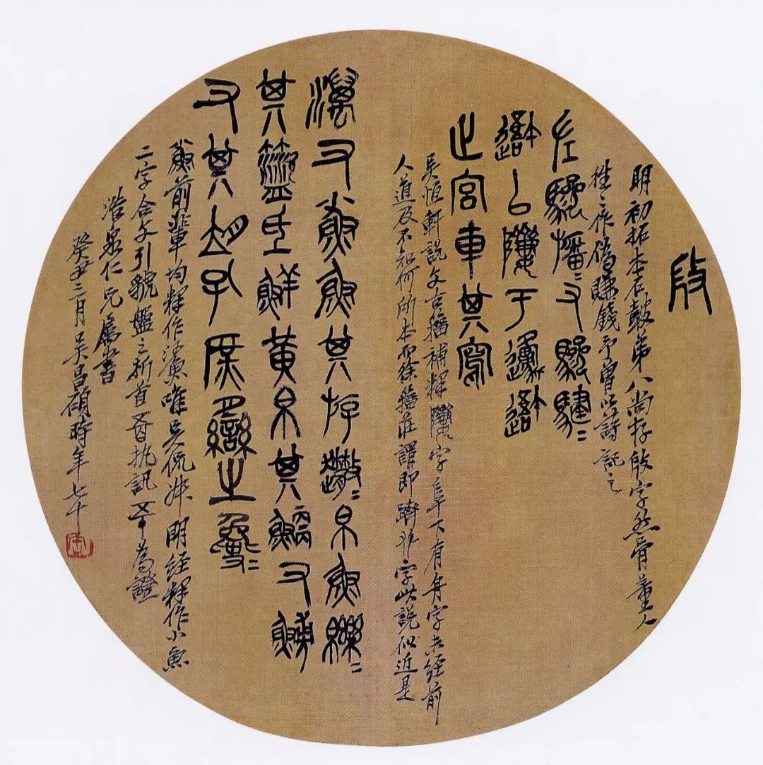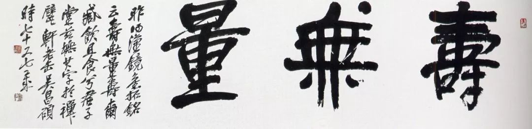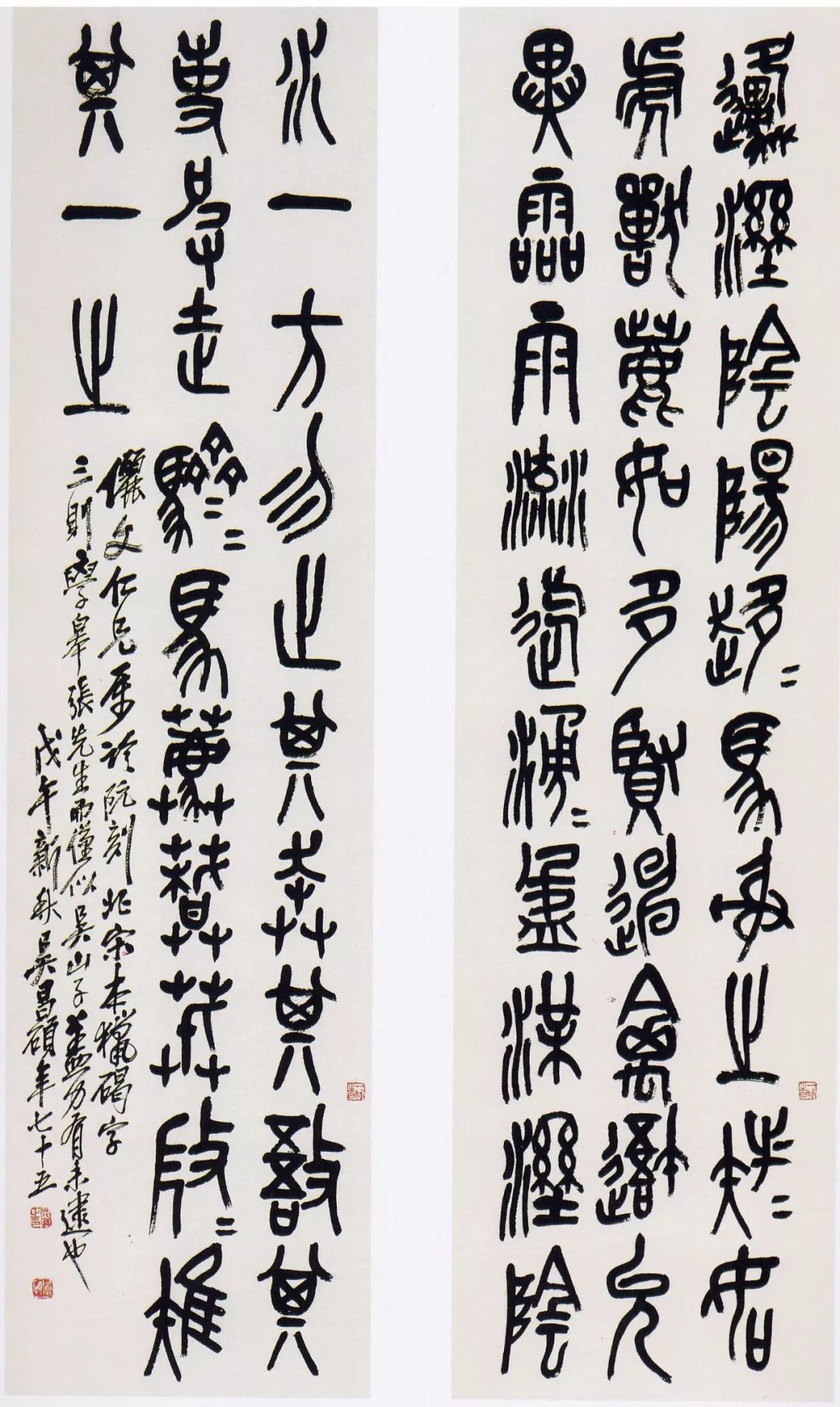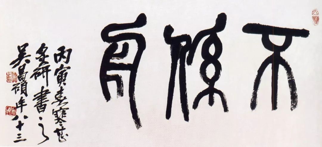 吴昌硕的书法得力于《石鼓文》,能探究石鼓书法的精义,并参以草法,学而能化。用笔峻利而能取涩势,力度大但不狂狠,线条浑厚但不重浊,故所书凝炼道劲,气度恢宏,墨色重实而松活,点画苍茫如石刻。