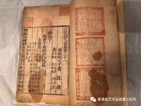 拍卖这册明刻《六臣文选》的拍卖行春拍中没有开设古籍善本专场,因而将征集到这本书放到了古代书画专场里。估价为9-11万元。那位藏家在翻阅古代书画图录时发现了这册书,并在预展时仔细研究了拍品的版本和印章。拍卖会上,他在起拍价9万元没人加价的情况下买到了《六臣文选》,加上佣金,共花费10.35万元。