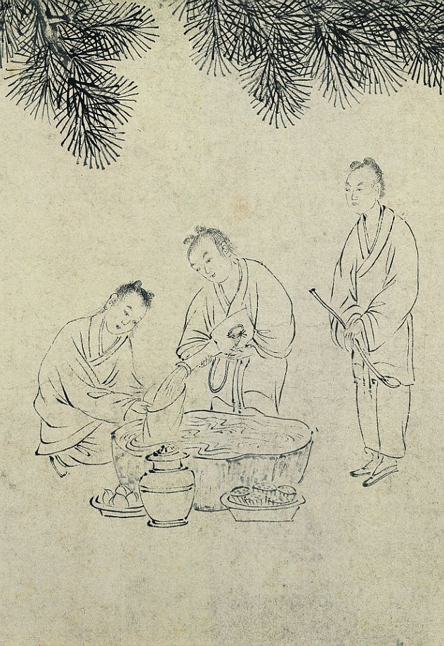 明代执壶类型多样,常见有鸡心式、梨式、玉壶春式等。陈洪绶所作《蕉荫听琴图》中,抚琴者盘腿坐于石板,听琴者手持白釉酒杯,端坐于石凳之上,侍童手捧玉壶春执壶盘坐于地上奉酒。明四家沈周所作《盆菊图》,杂树中设一草亭,四周以曲栏隔成庭院,院里墙边有盛开的菊花若干盆。亭内三人对饮,饮酒赏菊,意态悠闲,一侍童持玉壶春、执壶而立,布势疏朗,景物宜人,一派秋高气爽的意境。隔水茂树数株,景致简朴。明代蒸馏酒盛行,执壶除用于向杯中注酒之外,亦可作为盛酒器具,用于盛储宴会中暂时饮用不完之酒。除执壶之外,明代亦有盛酒器樽、杓。樽、杓是配合使用的盛酒器具,樽用于盛酒,杓将樽中之酒挹取至饮酒器具中。樽为敞口无盖三足容器,其只有盛酒功能并无储酒功能,樽中之酒如饮用不完要将其倒回至储酒器具中。故此器不可能用于饮用度数较高的酒液。