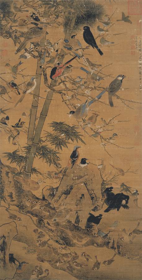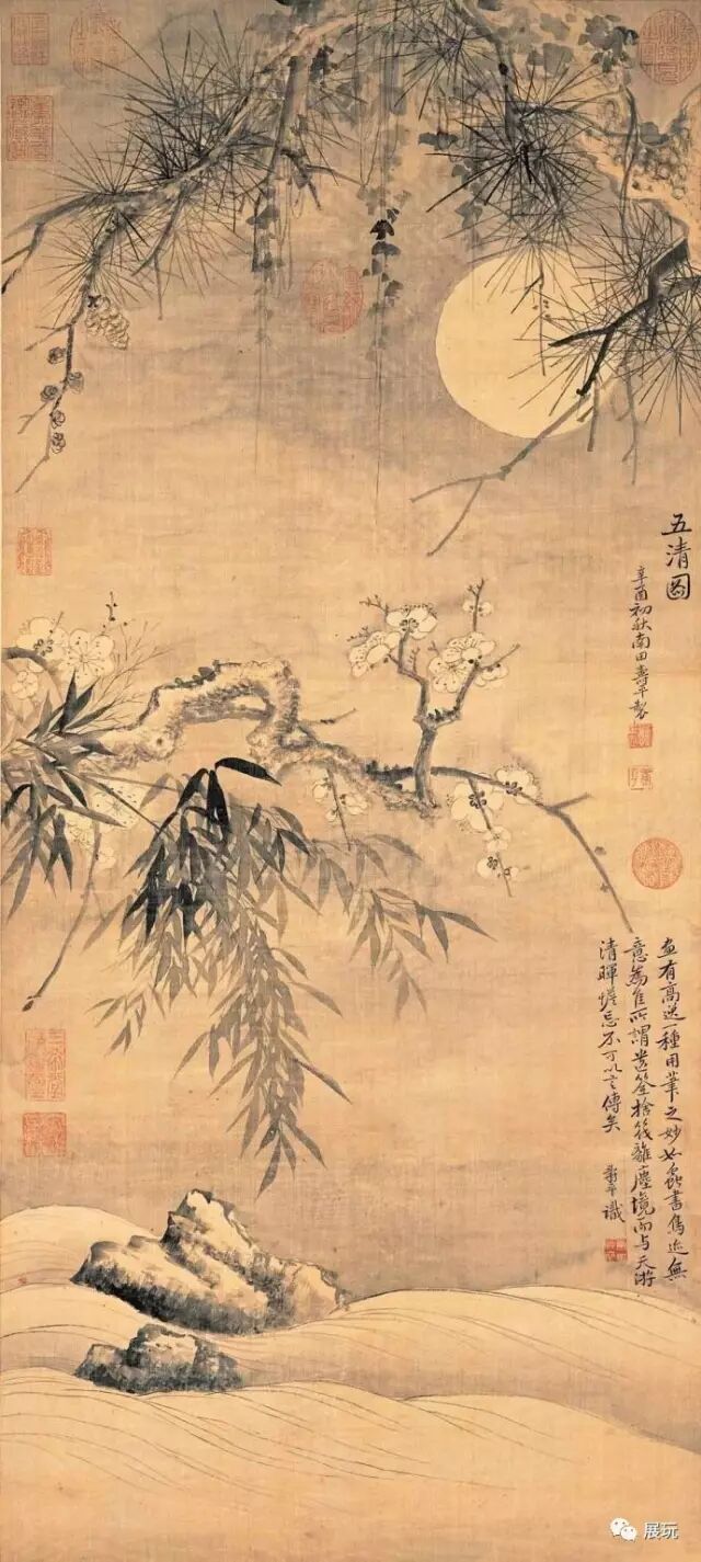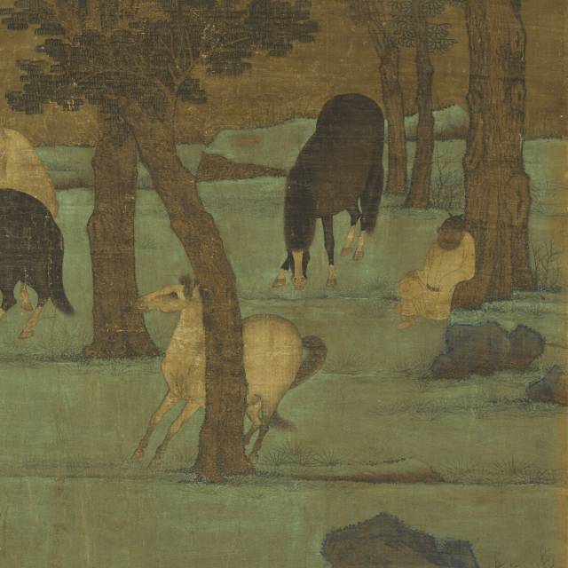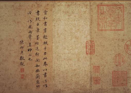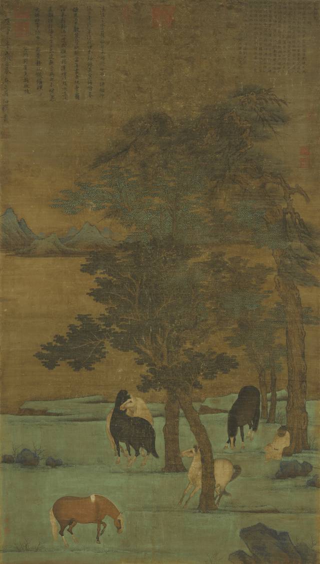 东晋王羲之(303-361),唐代韩幹(8世纪)、宋代燕文贵(967-1044)、徽宗赵佶(1082-1135)、高宗赵构(1107-1187)、朱熹(1130-1200)、文同(1018-1079)、陆游(1125-1210)、苏汉臣(12世纪)、牟益(1178-?),元代高克恭(1248-1310)、赵孟頫(1254-1322)、陈琳(13-14世纪)、卫九鼎(14世纪)、吴镇(1280-1354)、张雨(1283-1350)、赵雍(1289-1369)、倪瓒(1301-1374),明代边文进(15世纪)、戴进(1388-1462)、商喜(15世纪)、唐寅(1470-1524)、仇英(约1494-1552),清代王翬(1632-1717)、恽寿平(1633-1690)等人的代表作品。