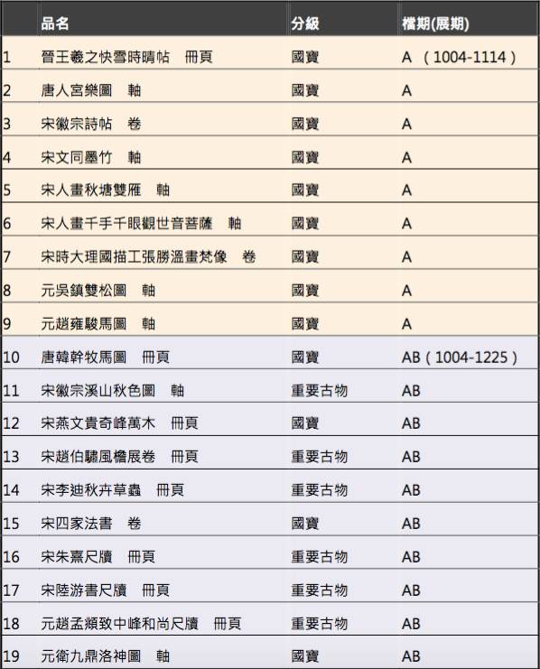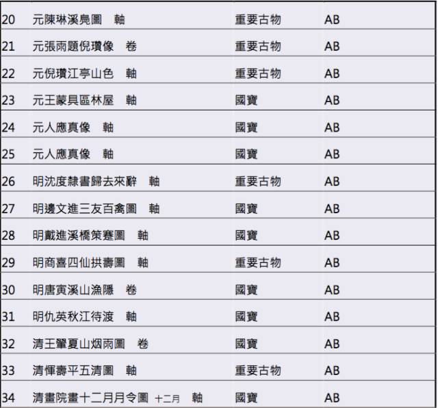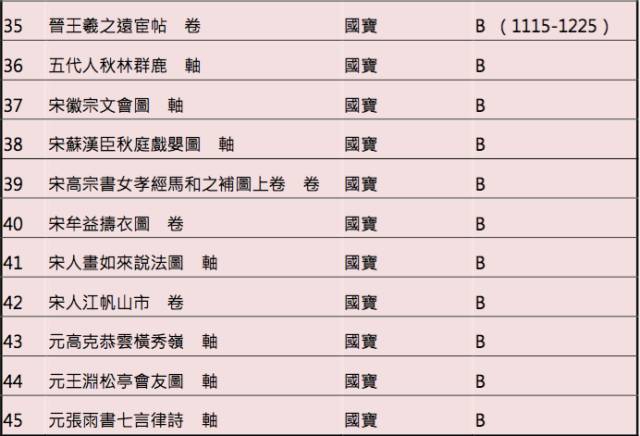 经由台湾文建会(文化部前身)古物审议委员配合故宫历次书画展览,进行实物勘验以及画面审议后,核定公告国宝306件,重要古物833件。