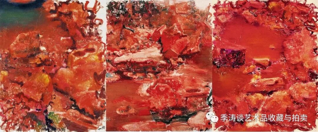 在单纯描绘“石头”的同时,周春芽也画了不少新表现主义风格石头内容的风景画,而这些风景画最为受到收藏家们的追捧,比如,周春芽作品在市场上曾拍出最高价4427.5万元的一幅《中国风景》就是在这一时期创作的。