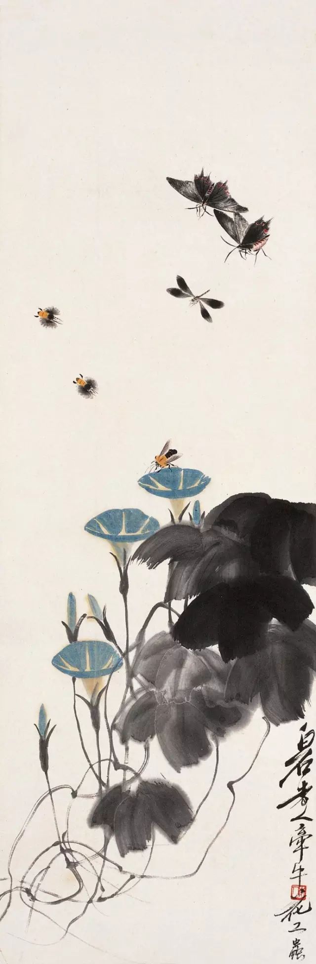 最终,他将工虫与大写意花卉结合起来,创立了“工虫花卉”的独特样式,一粗一细,一动一静,结合的让人心动。
