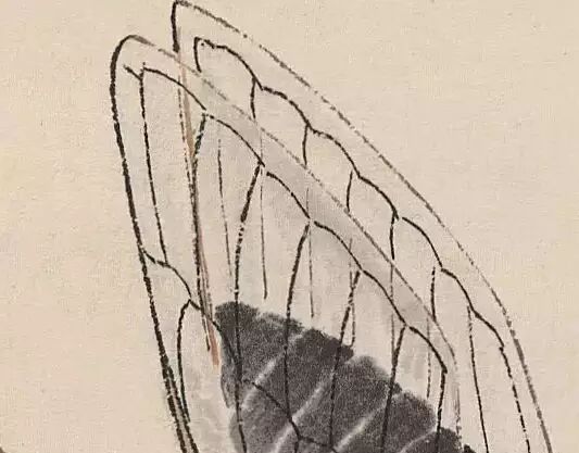 如他画蜻蜓翅膀上的网纹,用笔有轻重浓淡变化,增加了翅膀的动感;画水中草虫的长足,一笔瘦硬的线条及画出了长足的挺拔表现出关节的结构。