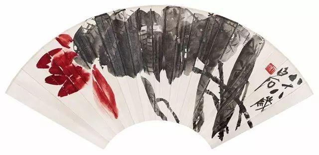 欣赏白石老人的墨荷,目光不自觉地就会投向画中 灿然绽放、红艳欲滴的荷花。在辛卯(1951年)作《红荷》立轴中(中国嘉德2010秋拍,2352万元成交),尽管荷 叶以赭石绘成,并占据了画面近一半的空间,但掩映其间的荷花却分外夺人眼球。据知,为了达成这样的艺术 效果,白石老人在使用胭脂红描绘这朵荷花时,采用了 近乎油画的手段,以浓烈厚重的笔触,赋予荷花强烈的 质感和层次,使这朵已经过了盛期,姿态略有衰败的残荷,散发出勃然的生命力。