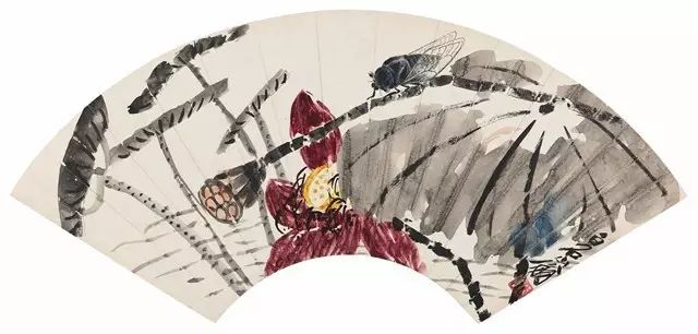 除了单独描绘荷花,齐白石还将包括鸟、虫、鱼、 虾在内的物象与荷花相结合,使得画作充满了动感,富 于浓郁的生活情趣。丁亥(1947年)作《红蕖蜻蜓》(嘉 德四季第二十六期拍卖会,713万元成交)即是其中佳作。此画描绘初秋时节,塘中荷叶渐黄、莲藕长成而红荷尚在, 此时一尾轻灵的蜻蜓闯进这静谧的画面,蜻蜓身体舒展, 两对透明的翅膀俯冲而来,轻盈天真。画面工写、红黑 相互衬映,营造了一片生气盎然之景象。齐白石于草虫一道颇占胜场,他的弟子于非闇评论说:“齐老师画工 笔草虫,有筋有骨、有皮有肉,使人耐看。例如画蜻蜓, 齐老师对四个翅膀的描写,先着力点写每个翅的主筋,用笔有去有来,瘦硬挺秀,使人一望而知这是翅膀的钢 筋铁骨。其余大部分网状纹,则是随着翅膀的筋节,一 笔一画的描写,又匀停,又润泽,使人看了有透明的感觉。” 《荷塘清趣》(中国嘉德2011秋拍,299万元成交),是另一幅值得赞叹的佳作。此作画面描绘一只蜻蜓落于 红荷之上,一旁翠鸟凝神低首,目光紧盯蜻蜓,似欲飞 而捕之。即暗合“小荷才露尖尖角,早有蜻蜓立上头” 之诗意,又增添了一份自然之情趣。且此作构图简便, 虽未画荷叶点绿,但盛夏之意趣,依旧让人感到浓绿满塘。 可谓无墨处巧夺天然,意味横生。
