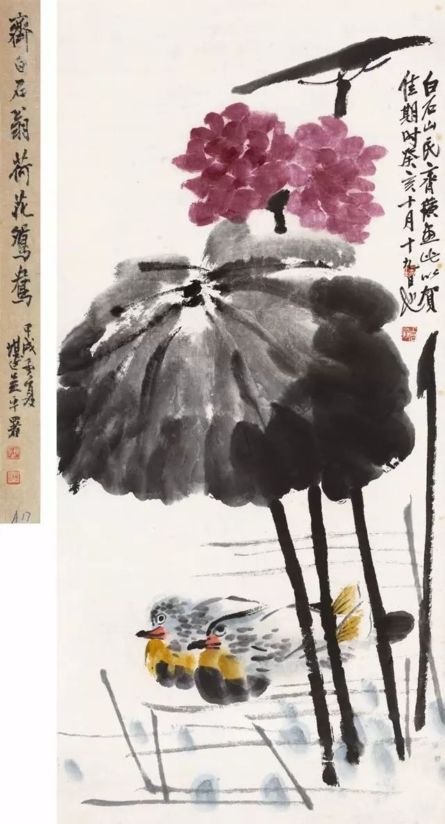 在齐白石的荷画创作中,“荷花鸳鸯”是影 响最为广泛的题材。通过荷花与鸳鸯的结合, 齐白石直接明了地表达了自己对于美好生活的向 往,这里面没有太多高深的哲理,没有复杂的文化诉求,有的只是质朴平凡的追求。 齐白石的“红荷鸳鸯”题材画作,构图大致相类,多为上实下虚。