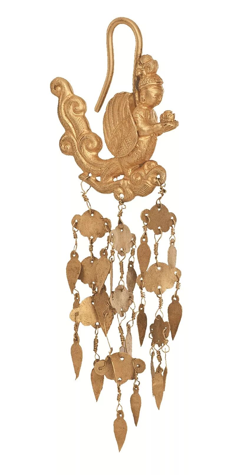 琉璃似月华,化作清丽悦人的明月珰。这份俏丽贯穿了整个秦皇汉武时期。一路至大唐却日渐式微,逐渐消失于闺阁女子们的耳际。许是因为那样一个自由奔放的年代,凡事追求富丽华美。当时罕有穿耳洞的妇女,却并不耽误她们装饰耳畔。于是出现了做工精湛的耳坠。唐代的金属工艺相当发达,匠人们将各色宝石、琉璃小珠穿于细细的金丝线上,围绕在同样用细金丝做成的花朵状的金丝球周围。再于其上弯出穿耳的金玦造型,以便姑娘们将耳坠夹戴于耳垂上。