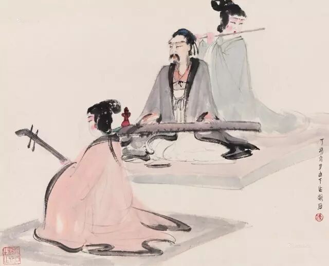 傅抱石 1947年作 谢安抚琴 镜心 设色纸本
