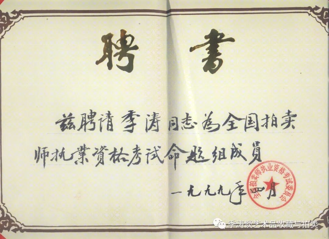 1999年起,全国拍卖师考试委员会在北京建立了全国拍卖师考试中心。1999年5月在北京举办了第五期拍卖师执业资格考试,考试第一次加入了主持技巧的内容,要求考生逐一上台主槌、考官现场予以打分,这一方式是当时国家人事部二十几个执业资格考试之中唯一一个带有模拟现场的考试形式。这时的我,已经被聘为拍卖师培训课程的授课教师、考试命题者以及技巧考试的考官了!