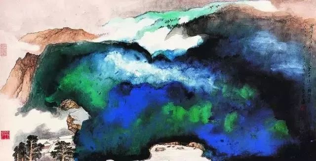 张大千的泼墨泼彩山水营造出了千姿百态的烟云效果和山势气韵,使得那如真似幻的抽象造型与客观上大自然的山岚云雾、云水飞动的具体形象有机完美地结合在一起。