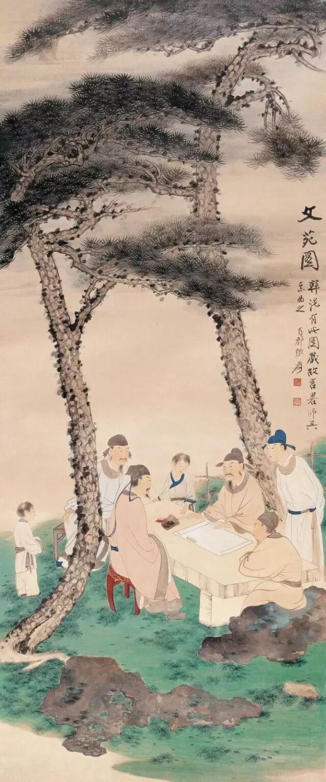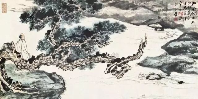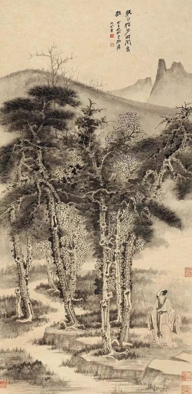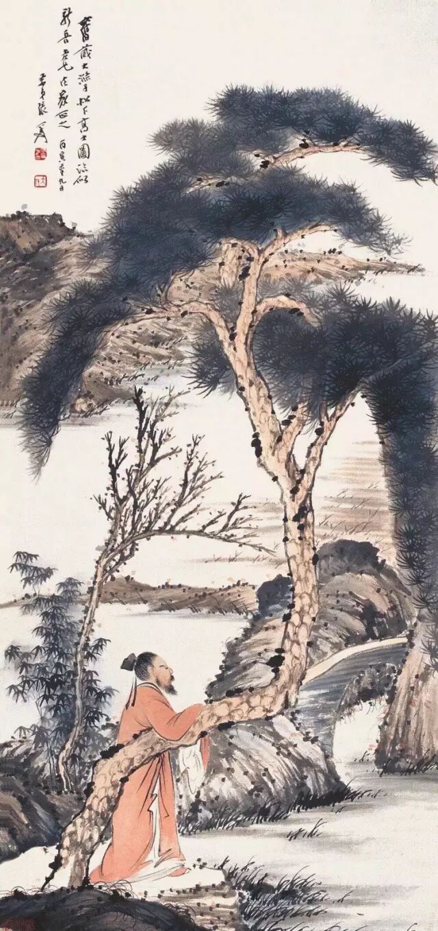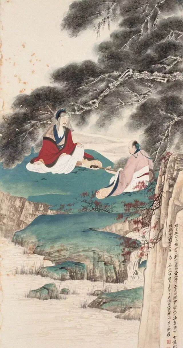 张大千喜好以松荫高士为题材的创作,将高逸之士以概念化的形象置于山水林泉之间,象征士大夫归隐后的生活,抒发希冀纵情于物外的情致。无论是早年的俊逸秀美、中年的精工富丽,还是晚年的沉郁朴拙,都令人感慨其人物画创作兼具古今的眼界、其笔下人物清丽雅逸的名士风度。