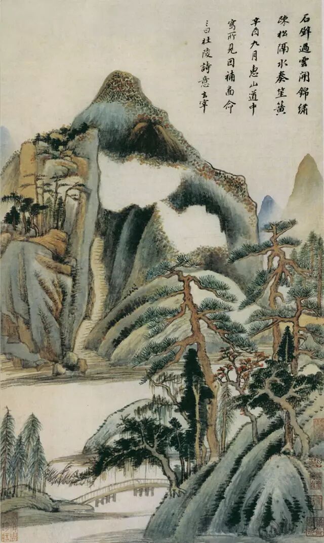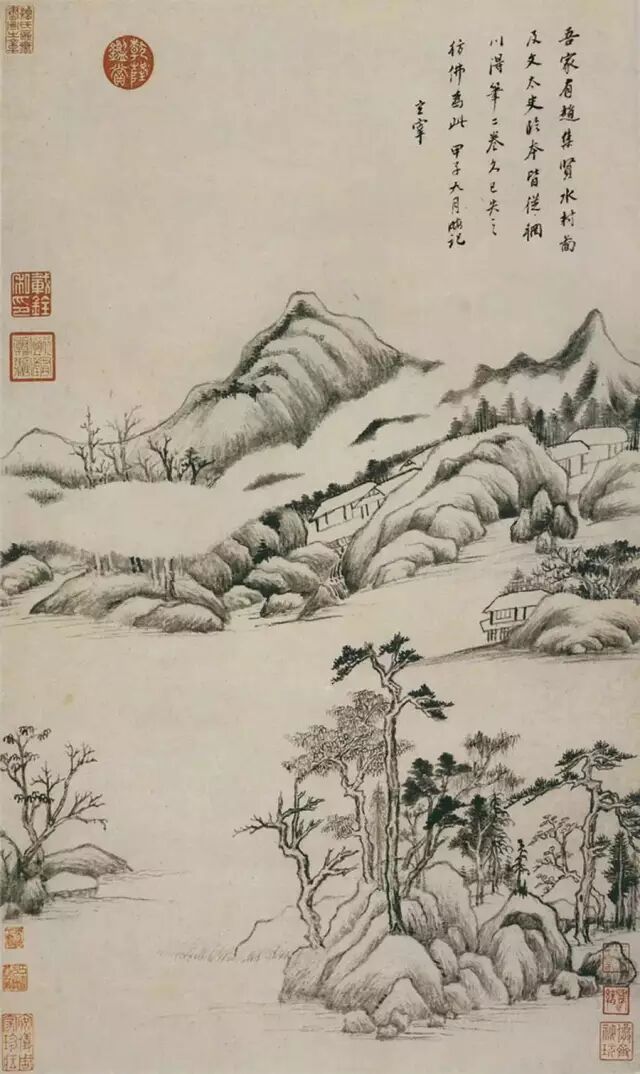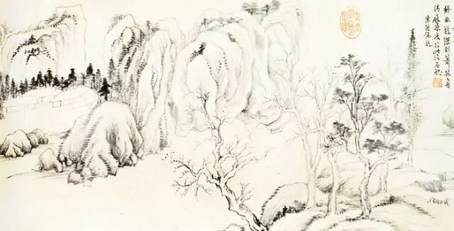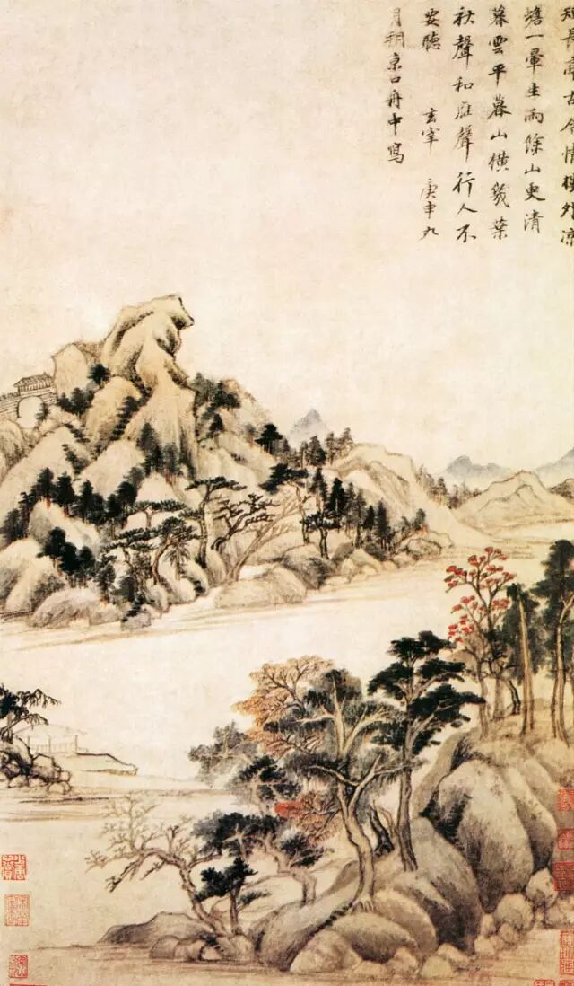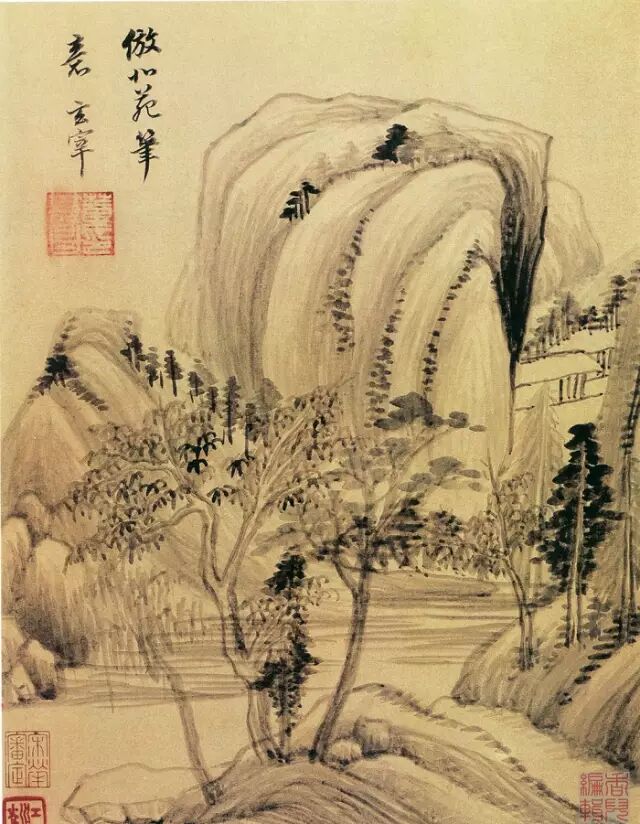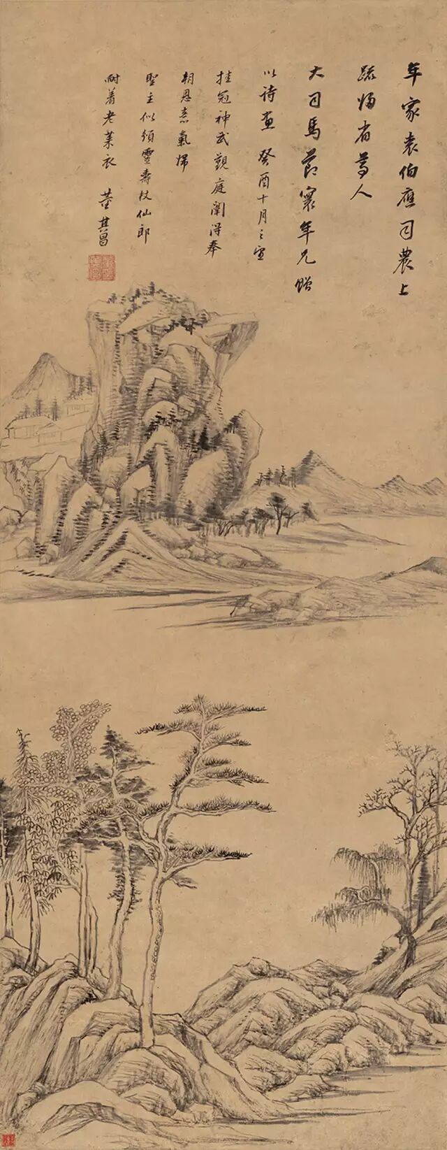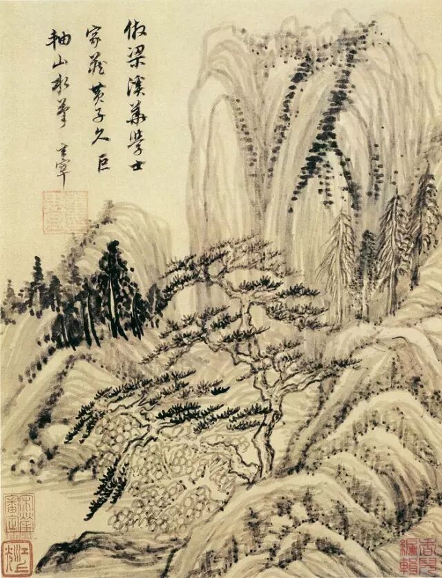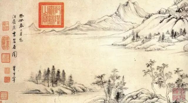 董其昌的山水画大体有两种面貌,一种是水墨或兼用浅绛法,这种面貌的作品比较常见;另一种则是青绿设色,时有出以没骨,比较少见。他十分注重师法古人的传统技法,题材变化较少,但在笔和墨的运用上,有独特的造诣。