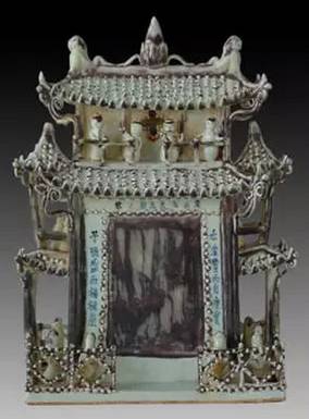 青花釉里红瓷仓,元代楼阁式瓷仓,1974年江西省景德镇出土,现藏于江西省博物馆。这件楼阁式瓷仓,造型别致,虽然是随葬冥器,仍不失为珍贵的工艺品。青花釉里红瓷器,甚为罕见,作为楼阁式瓷仓,并且有明确纪年,迄今仅为孤例。