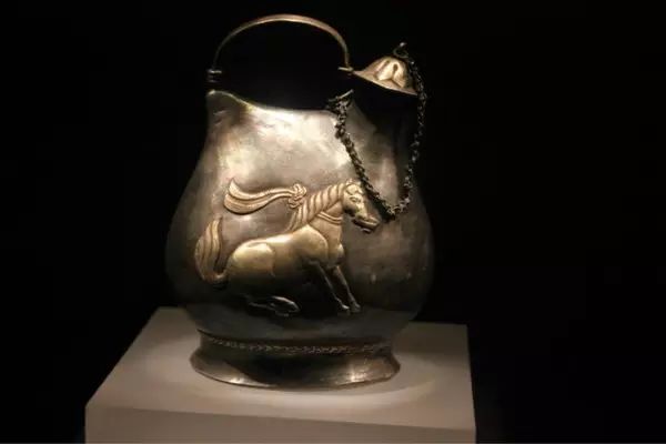 鎏金舞马衔杯纹银壶,唐朝的文物,1970年窖藏出土于陕西省西安市南郊何家村,高14.8厘米,口径2.3厘米。现收藏于陕西历史博物馆。马身和提梁、壶盖及“同心结”纹带均鎏金,使得银壶富丽堂皇,明快悦目。该壶构思巧妙,工艺精细,古今未见类同者,堪称国宝。