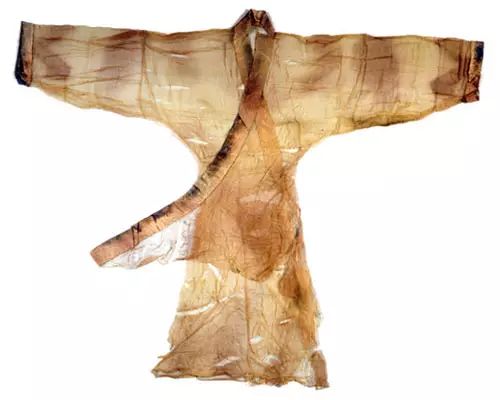 直裾素纱襌衣(“襌”音dān,常被误写做“禅”),西汉织绣, 1972年出土于长沙马王堆一号汉墓,现收藏于湖南省博物馆。该衣长128厘米,通袖长195厘米,袖口宽29厘米,腰宽48厘米,下摆宽49厘米。直裾素纱襌衣是存世年代最早、保存最完整、制作工艺最精、最轻薄的一件衣服,在中国古代丝织史、服饰史和科技发展史上有着极为重要的地位。