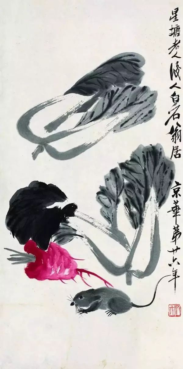 齐白石爱大白菜是出了名的,一天他在画室里听到外面有呦喝卖大白菜的,便想画一张白菜去换白菜,谁知被卖菜汉子一顿咆哮: