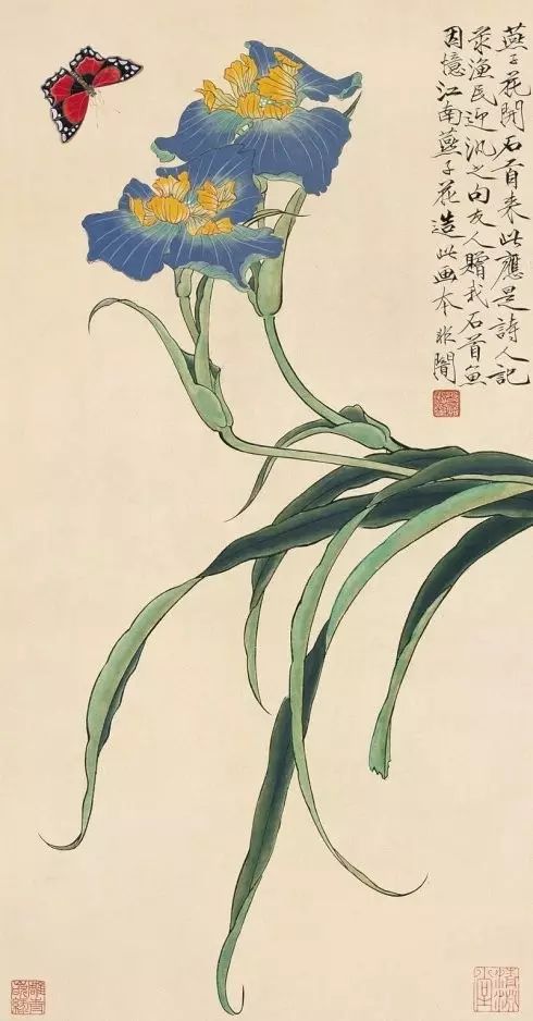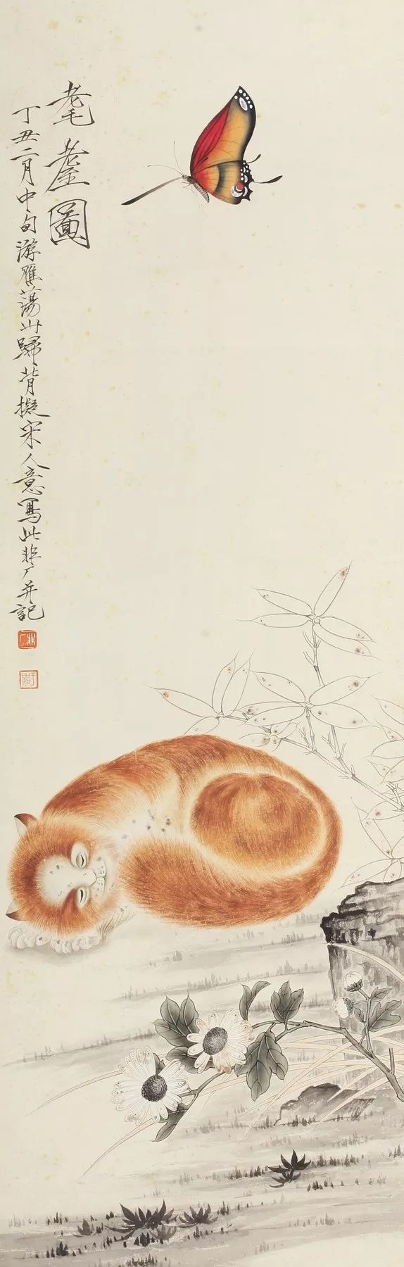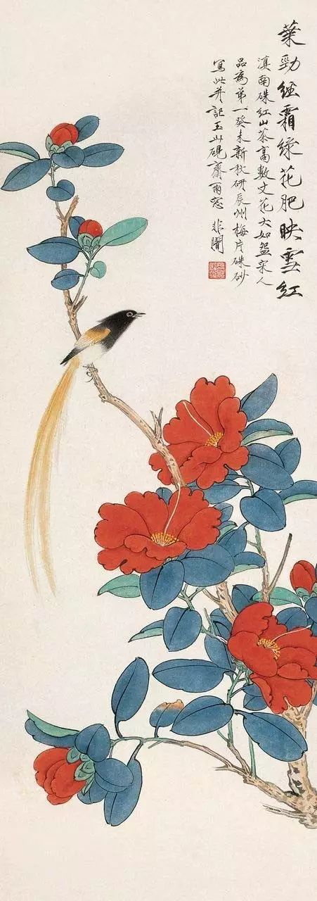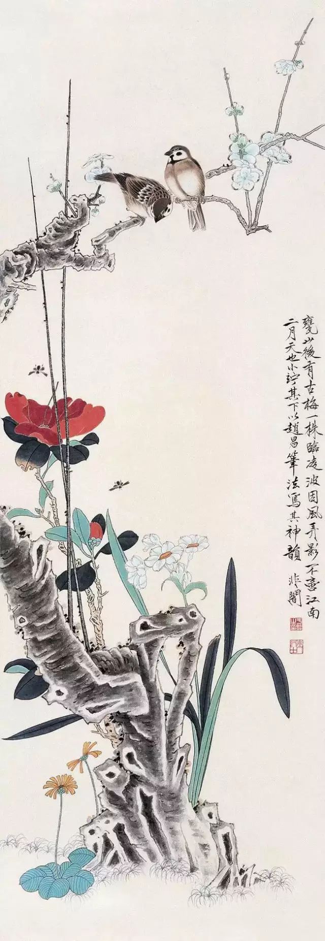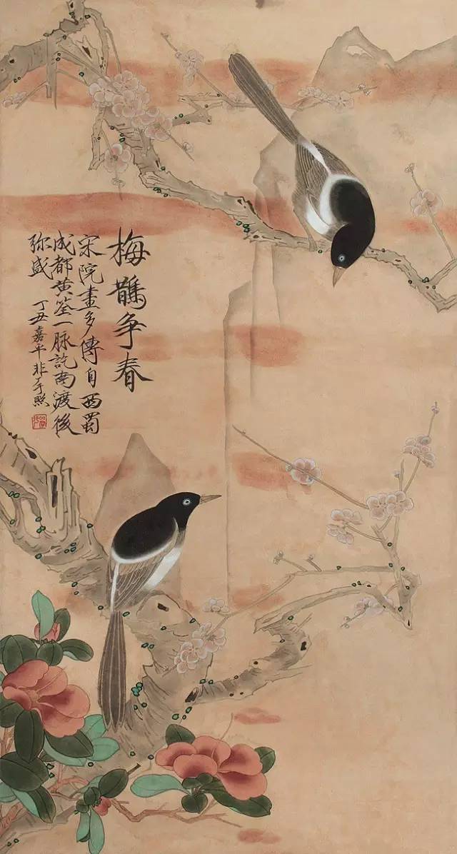 从外因讲,除前述时尚的变化,启蒙教育埋下的种子之外,张大千对他的启发亦不容忽视。于非闇与张大千是莫逆之交,于非闇曾为张大千代言与徐燕孙笔战,张大千也时常关注于非闇的绘画艺术。据包立民先生考证,张大千曾劝于非闇弃小写转工笔,专攻双勾花鸟画,并配以瘦金书题款,于非闇听了他的意见,便致力于此,逐步形成了于派工笔花鸟画的样式和语言。