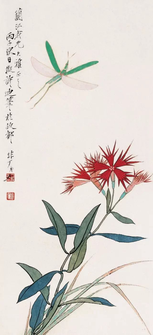 ▲于非闇《草花蚱蜢》立轴,丙子(1936年)作