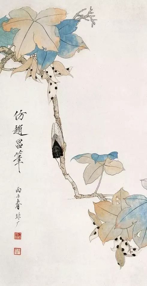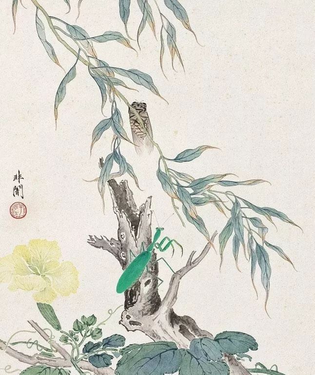 辛亥革命那年,22岁的于非闇改回山东蓬莱原籍,开始向民间画师王润暄先生学画花鸟、草虫,并学习饲养昆虫及研制颜料之法。这位启蒙老师擅工笔花卉草虫,尤以画蝈蝈闻名于世,对于非闇终生的艺术样式都产生着影响。此后,于非闇曾广泛地涉猎过山水、花鸟,工笔、简笔,以半工半简、勾花点叶的花卉居多。